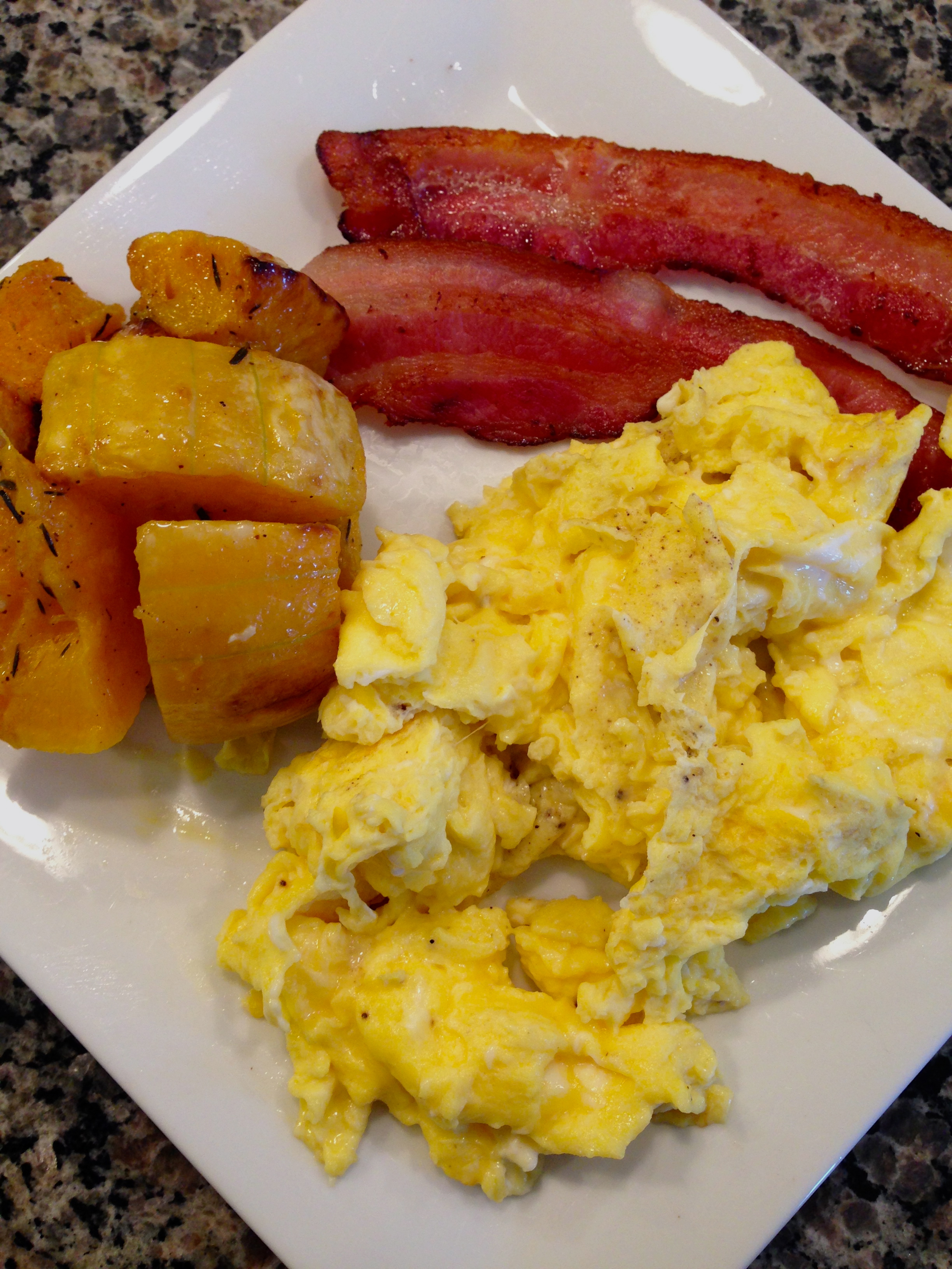 Following these random appetizers we enjoyed a roasted chicken from Wegman’s (please excuse the one legged chicken pictured below, someone got into it before we sat down for dinner) and a Creamy Paleo Bacon Pumpkin Soup from Fed & Fit.